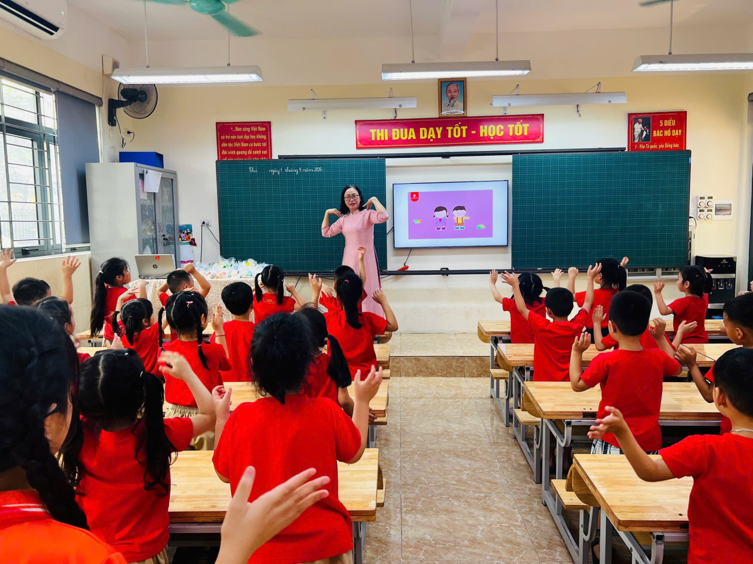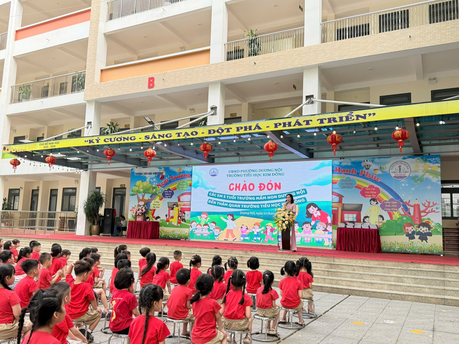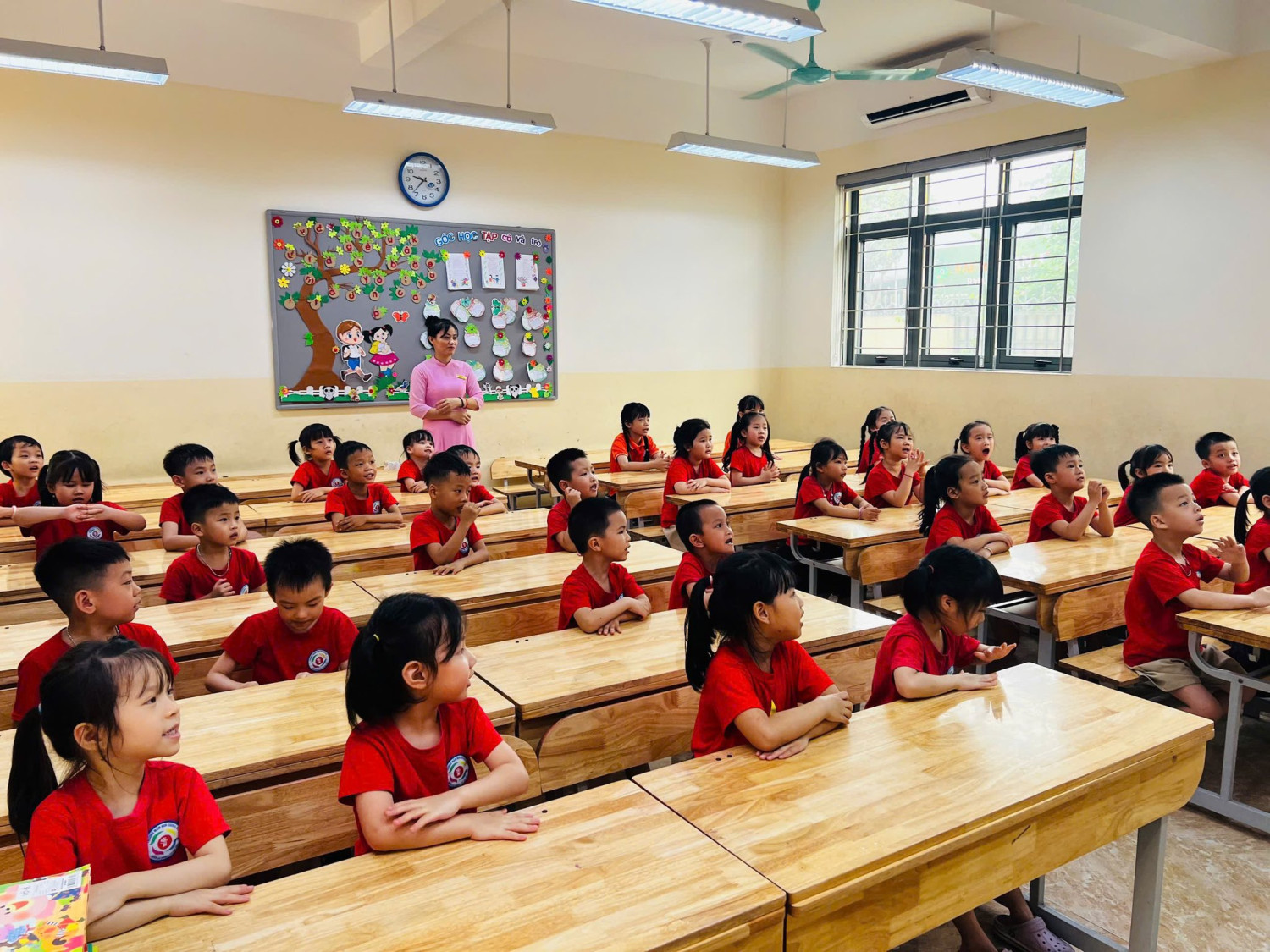 Tại đây, các bé được tham quan khuôn viên trường, lớp học và làm quen với môi trường học tập mới. Đặc biệt, các bé còn được vào lớp, ngồi thử bàn ghế và trải nghiệm không khí học tập của học sinh tiểu học.